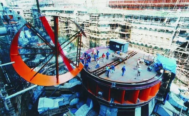 ▲三峡水电站右岸22号机组围绕座环挂装蜗壳 (资料图片)